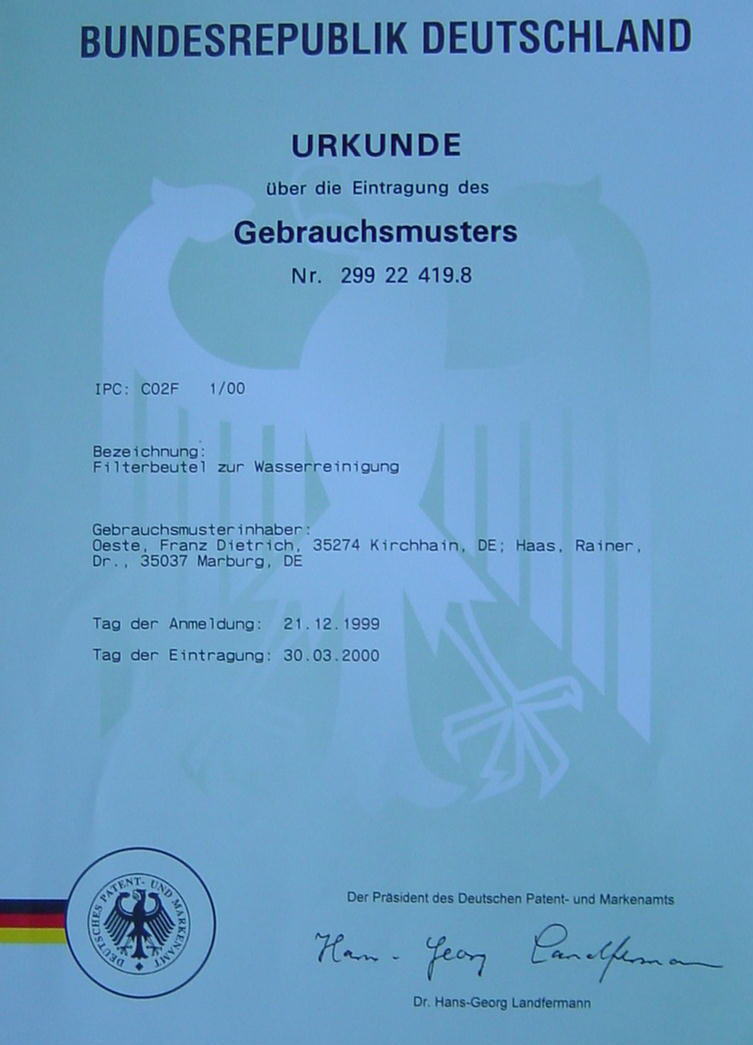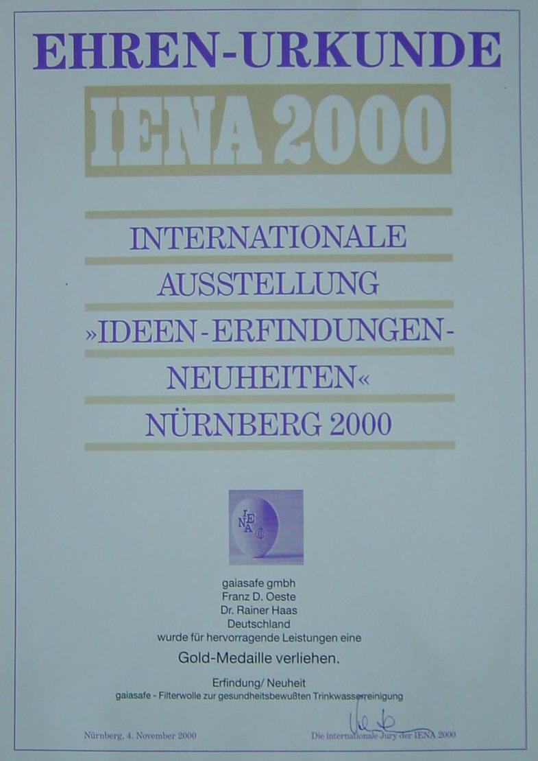 ienau.jpg: Urkunde Erfindermesse IENA 2000 in Nürnberg; gaiasafe-Filterwolle zur Trinkwasserreinigung
