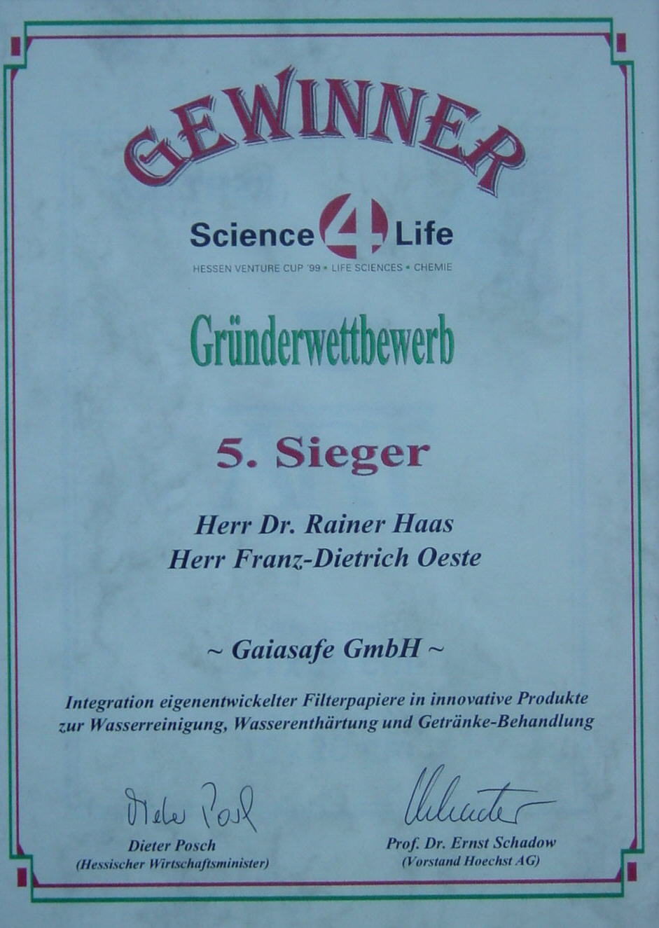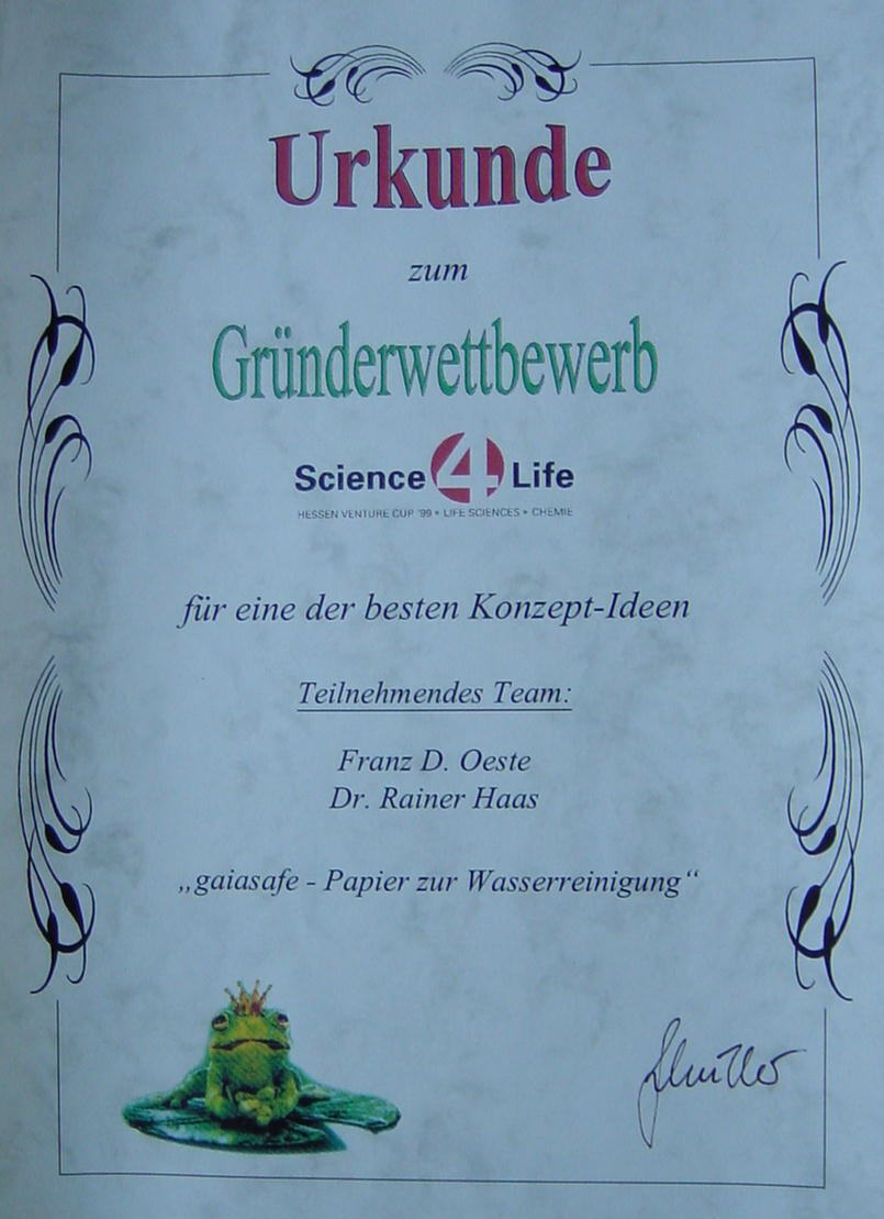 s4l1.jpg: Gründerwettbewerb Science4life 1999; Prämierung der Konzeptidee gaiasafe-Papier zur Wasserreinigung